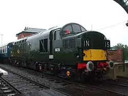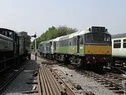 D7523 was built by British Railways at Derby in 1965 and started its career at Toton TMD before moving around various London Midland Region sheds such as Willesden, Longsight, and Crewe. It was renumbered 25173 in 1974.[12] It had been based at the Crewe Heritage Centre and on the West Somerset Railway.[13] It arrived at the railway on 7 September 2011 and will be used for engineering and ballast trains and for maintenance and testing of vacuum-braked coaches.[14] It is currently in BR Green, Undergoing heavy overhaul.[8]