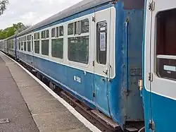 The railway has the two driving cars from what was a three-car Class 117 DMU. There were 127 of this type of vehicle and they were delivered new in 1959 to Southall depot working services between Paddington and the suburbs. They continued to be based in the London area until withdrawal in the 1990s, they arrived at the Railway in 2004. Each coach has two Leyland diesel engines underneath, which drive the wheels mechanically through a fluid flywheel. The driver's cab at each end of the unit means it can be driven from either end, making it ideal when running to Coopersale, and speeding up turn-around times. The windows in the ends mean passengers in either coach get an excellent view of the line ahead or behind and also get to watch the driver in action. The unit ran in an unusual dark blue and white 'EOR' livery until 2007, when it was taken out of service by the new owner when services were suspended. The interior has been refurbished, the unit is receiving attention to the exterior bodywork. DMBS is being restored; DMS is in service twinned with a Class 121 unpowered driving trailer.[16]
