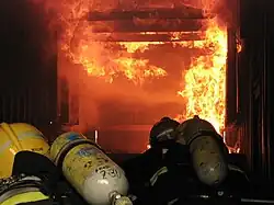 Rollover (also known as flameover) is a stage of a structure fire when fire gases in a room or other enclosed area ignite.[1] Since heated gases, the product of pyrolysis, rise to the ceiling, this is where a rollover phenomenon is most often witnessed. Visually, this may be seen as flames "rolling" across the ceiling, radiating outward from the seat of the fire to the extent of gas spread.