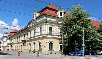 The Roman Catholic Episcopal Palace is one of the most representative baroques buildings in Timișoara, although some of the original details disappeared with the transformations and renovations from the late-19th century and afterwards.[15] From an architectural point of view, it is a building with a ground floor and a first floor whose façade is punctuated only by the simple rectangular windows. Remarkable is the baroque portal, with some rococo elements, which emphasizes the entrance to the building, on Pacha Street. The gate is provided with a rich decoration and a mascaron in the keystone, above it.[16] The building, at the four corners, had pavilion constructions protruding from the façade, reminiscent of the corner towers of castles, of which only two have been preserved, at the corners of Pacha Street.[15]