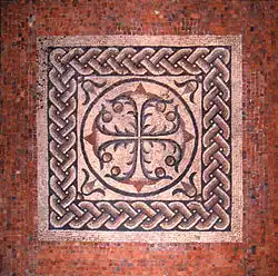 The location of Londinium's original cathedral is uncertain. The present structure of St Peter upon Cornhill was designed by Christopher Wren following the Great Fire in 1666, but it stands upon the highest point in the area of old Londinium and medieval legends tied it to the city's earliest Christian community. However, the east end of St Peter's and its high altar, is also positioned above the area where some basilicas of the period had a pagan shrine room (also known as an aedes). Wheeler proposed that a Christian church might have been established on its site and that this accounted for the later medieval legends.[112][113] The possible existence of the shrine room is supported by 19th-century excavations under Gracechurch Street, immediately adjacent to the church's eastern end. These unearthed an adjoining room covered in yellow panels with a black border, 'with a tessellated floor, suggesting it may have had a higher status than normal, possibly acting as an antechamber for the aedes or shrine-room'.[114] The alignment of the church is close to the lines of the basilica, being off by just two degrees, and it is feasible for the understructure to have utilized the dry solid 2nd century basilica wall fabric for support.[115]