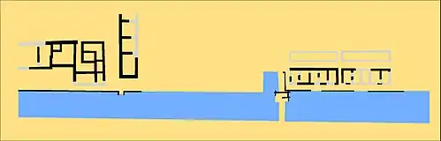 In addition to small pedestrian postern gates like the one by Tower Hill, it had four main gates: Bishopsgate and Aldgate in the northeast at the roads to Eboracum (York) and to Camulodunum (Colchester) and Newgate and Ludgate in the west along at the road that divided for travel to Viroconium (Wroxeter) and to Calleva (Silchester) and at another road that ran along the Thames to the city's main cemetery and the old ford at Westminster. The wall partially utilised the army's existing fort, strengthening its outer wall with a second course of stone to match the rest of the course.[89][94] The fort had two gates of its own – Cripplegate to the north and another to the west – but these were not along major roads.[94] Aldersgate was eventually added, perhaps to replace the west gate of the fort. (The names of all these gates are medieval, as they continued to be occasionally refurbished and replaced until their demolition in the 17th and 18th centuries to permit widening the roads.)[94][95] The wall initially left the riverbank undefended: this was corrected in the 3rd century.