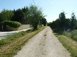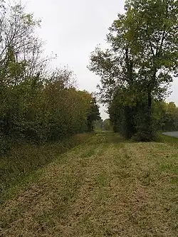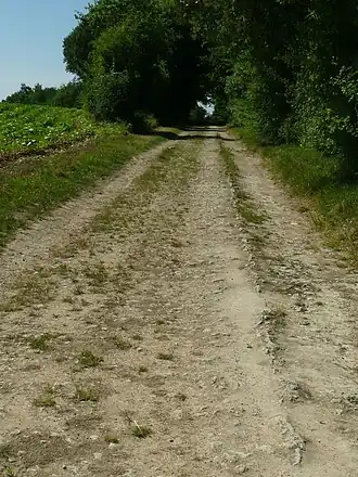 Following a generally straight course toward Saint-Sauvant in Charente-Maritime, the road is intermittently overlaid by departmental roads or remains as a rural path, locally known as the chemin des Romains. It passes through Sainte-Sévère, near the remains of a fortified camp—once believed to be Roman—located about 150 meters south of the road[24] and north of the village of Cherves. The road also crosses the Antenne River at the Saint-Sulpice bridge.[25]