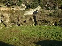 The amphitheatre stands on a slope: to reinforce the platform on which it was built, a terrace had to be constructed, 6.75 m high and 59.6 m long, running parallel to the amphitheatre's perimeter to the west at an average distance of 23 m.[1] The terrace wall, adorned with fourteen niches positioned 2.1 m above the ground, is built with irregular layers of peperino ashlars and bricks.[1]