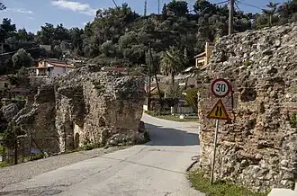 The Roman aqueduct is a major work of the Roman period in Greece and a vital part in the water supply of Roman-era Patras. Today parts of the aqueduct are visible around the short Patras' bypass road and the neighborhoods of Aroi and Asyrmatos.[1] The aqueduct measured 6.5 km (4.04 mi) from the springs of Romanos to the city acropolis, today part of Patras Castle. For the greater part of this distance, the water passed through an underground channel, passing over valleys and gorges on carefully constructed archways, parts of which still stand.