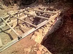 Furnace "A" is a type c.d. "muffle" furnace.[7] There are very few examples of this type in Europe, and archaeology scholars maintain an absolute reserve on them.[8] The structure of the "praefurnium" and part of the rectangular corridor (60 centimetres wide and 2.7 metres deep), which served to introduce firewood into the combustion chamber, is clearly visible.