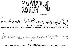 An example here demonstrates a familiarity with Virgil and hexameter verse. On the doorpost of the shop near pictures of Aeneas and Romulus is written:[7]