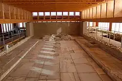 The excavated area is of a residential villa (or pars urbana) but from aerial photography and geophysics, a site located just 1.5 km away in the Sedia d'Orlando area was probably the agricultural part (pars rustica) of the villa. Several buildings including a three-winged porticoed building, a warehouse with dolia, a duct system and a series of furnaces could have been for the storage of products with an adjoining port on the Carapelle river.[9]