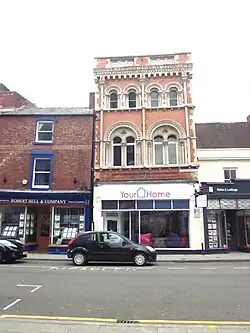 In the 1860s, Romanesque architecture became a popular style of architecture for Dissenting chapels. Possibly this was intended to give the impression that they were churches similar to Anglican churches and they are often referred to as churches rather than chapels. This form of architecture was often chosen by the Baptists. This architecture is an adapted and debased form of Italianate Romanesque as seen at the Potter's Bar Old Baptist Church in Hertfordshire in 1859.[31] The Baptist Church in Brown Street Salisbury of the 1880s is similar in bright red brick and was built in the 1880s. It is noticeably more archaeologically correct in its use of arched windows and the entrance door. A Baptist Chapel of 1870 by the Lincoln architects Drury and Mortimer, the Mint Lane Baptist Chapel in Lincoln is in a debased Italianate Romanesque revival style but has a surprising tower in the castellated Gothic style.[32]