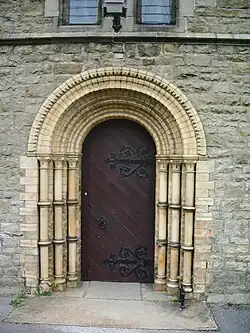 The development of the Norman revival style or Neo-Norman took place over a long time in the British Isles starting with Inigo Jones‘s re-fenestration of the White Tower of the Tower of London in 1637–38 and work at Windsor Castle by Hugh May for Charles II, but this was little more than restoration work. More surprising is the west door of Kenilworth Church, inserted in the tower in 1570 probably at the time of a visit of Queen Elizabeth. This appears to have been historic arch, sourced possibly from an unknown monastic building,[2] Another early example of Romanesque revival is the south porch of North Scarle Church in Lincolnshire. Pevsner suggests that it might be Elizabethan, but late 17th. century seems more likely as the oak door seems to be original and probably of that date.[3]