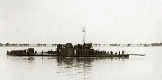 During the first month of Operation Barbarossa, the Flotilla fought several engagements against its Soviet counterpart, damaging two Soviet monitors and two patrol boats and sinking another patrol boat.[38][39] The Romanian monitor Mihail Kogălniceanu also shot down one Soviet aircraft on 29 June 1941.[40] Wartime additions to the Flotilla amounted to two small Czechoslovak-built minelayers (transferred from the Kriegsmarine).[41] After the 23 August 1944 coup, the river monitors of the Flotilla prevented German troops from crossing the Danube from Bulgaria and also captured German ships along the river between 24 August and 31 August. Ardeal and Lahovary captured 26 ships, while Basarabia and Bucovina captured 82 ships and a medical convoy.[42][43]