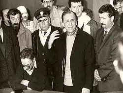Meanwhile, Secretary to the Central Committee Emil Bobu and Prime Minister Constantin Dăscălescu were sent by Elena Ceaușescu (Nicolae being at that time in Iran) to resolve the situation. They met with a delegation of the protesters and agreed to free the majority of the arrested protesters. However, they refused to comply with the protesters' main demand— the resignation of Ceaușescu—and the situation remained essentially unchanged.[35]