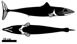 The appearance of Romerodus was typical of a caseodontid.[6][11] The gill arches may have supported either separated, shark-like gill slits or a single chimaera-like operculum (gill cover).[11][12]: 143–144, 167 According to Zangerl's 1981 description, the profile was fusiform, with a forked, homocercal caudal fin and greatly enlarged keels at the base of the tail (termed the caudal peduncle).[1] No specimens show any indication of pelvic fins, a pelvic girdle, or claspers,[1][13] suggesting that these structures were either greatly reduced or absent in life.[6][12]: 167–169 Neither a second dorsal fin nor fin spine has been identified, as in other eugeneodonts.[1][14]