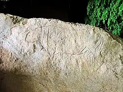 The bull, an Aurochs (Bos primigenius) is about 1.2 m (4 ft) long located at the mouth of the cave to the west and is engraved on three different levels of profiles. The stylistic scope is characteristic of the Mediterranean and the design of perfect proportions. The feeling of force transmitted from the overall design of the figure and the careful handling of the anatomical details amounts to the highest expression of Paleolithic realism in the region. In front of the rock another bovine figure has been cut, much more subtly, showing only the chest, head and part of the back.[4] On the opposite end of the shelter sits another engraved boulder, covered with numerous linear signs. Both engraving are dated to between 14,000 and 12,000 BP.[5]