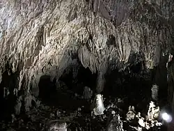 The site consists of two distinct areas: an outer former rock shelter or overhang with a length of 34 m (112 ft) and the inner cave, embedded into the limestone formation with a length of 20 m (66 ft) and accessible via a narrow tunnel. The interior is graced with a number of curiously shaped speleothems and prehistoric graffiti.
