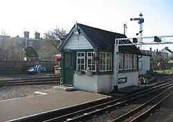 Dymchurch - confusion surrounds the number of levers in this box, with different sources quoting 10,[32] 12[33] and 16.[34] The box had vanished by 1963 and signalling is controlled here today by a push button electronic panel in the booking office and a 2 lever ground frame released by an Annett's key normally held in the signal panel.