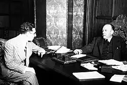 In 1942 de Toledo was confirmed as member of the Francoist elite when re-appointed on position 46[132] to III Consejo Nacional.[133] When during first major redressing the system a quasi-parliament Cortes Españolas was set up, in 1943 by virtue of membership in Consejo de Toledo automatically became its member.[134] This sequence of appointments continued; in 1946 he was nominated to IV. Consejo Nacional (position 22)[135] which triggered nomination to the II. Cortes,[136] while the 1949 nomination (position 21)[137] guaranteed his seat in the III. Cortes.[138] Throughout all these years he remained Director General de Primera Enseñanza and one of the most influential people shaping the education system. His term came to the end after 12 years, when in 1951 Ibáñez Martín ceased as minister of education and was replaced by Joaquín Ruiz-Giménez Cortés. It is not clear whether de Toledo was forced to resign or whether he decided to go himself; following a solemn farewell ceremony, he left the ministry in July 1951.[139]