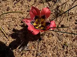 Romulea sabulosa is a perennial geophyte that is assigned to the family Iridaceae. It has a few grooved thread-like leaves, and relatively large burgundy red trimerous flowers, reminiscent of crocus flowers, with yellow to light greenish with black markings and stamens with light green free filaments. It only occurs on sandy clay on renosterveld west of Nieuwoudtville in the Northern Cape province South Africa. It is called satynblom in Afrikaans.[1]