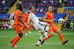 Following the end of the World Cup tournament, Vlaar was called up to the national team squad once again on 9 August 2010.[264] He captained his first match for Netherlands against Ukraine on 11 August 2010 and started the whole game to help the national side draw 1–1.[265] He then spent the next eighteen months being placed on the substitute bench and didn't play for Netherlands as a result.[266] This lasted until 29 February 2012 when Vlaar made an appearance, coming on as an 82nd-minute substitute, in a 3–2 win against England.[267] On 7 May 2012, he was named in the provisional list of 36 players for the UEFA Euro 2012 tournament by van Marwijk.[268] After speaking out his determination to be in the squad ahead of the tournament, Vlaar eventually made the cut for the 23 man squad.[269] On 2 June 2012, he scored his first international goal with a header from a corner kick by Ibrahim Afellay, the last goal in a 6–0 friendly win over Northern Ireland.[270] Vlaar made his first appearance of the UEFA Euro tournament, forming a centre–back partnership with John Heitinga, in a 1–0 loss against Denmark on 9 June 2012.[271] After being dropped to the substitute bench in the next match against Germany, he returned to the starting line–up against Portugal, as the national team lost 2–1 on 17 June 2012, resulting in them finishing bottom of their group.[272] Following the end of the tournament, Vlaar reflected on the experience, saying: "I already had the feeling that I was close to it. I've had good weeks here. But I can't be satisfied with that now. I am disappointed because you are a sportsman and you want to perform. Later I may be able to look back on this European Championship in a more positive way for me personally."[273]