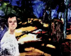 Walsh first exhibited paintings at the age of seventeen, drawing attention both from the Irish Times and the Irish Independent.[4] His early work, primarily landscapes with people, possessed the lyrical, semi-abstract, slightly Surrealist aesthetic that could then be seen in the contemporary work of older Irish artists such as Patrick Collins, Louis le Brocquy and Walsh's own father, the artist Owen Walsh. Subsequent to graduating from NCAD, the setting and the aesthetic of the paintings begins to change. The semi-abstract, pastoral landscapes are replaced with more figurative depictions of urban settings; the early romantic lyricism gives way to a harder-edged Expressionist style articulated through thick, heavily textured paintwork and the utilization of found objects. At this time, 'his handling of paint is raw, his approach is physical and aggressive,'[5] But Walsh's style was not traditionally Expressionist: 'actually there is very little of the archetypal German Expressionist about Walsh, his use of colour is more comparable to the French.'[6] Towards the end of the eighties, Walsh becomes affiliated critically with the Neo-expressionist and Transavantgarde movements in Europe. The shift from abstraction "towards figuration [7] and greater realism becomes most pronounced in the 1990s, a decade in which Walsh also shifts his focus from the urban to a more natural setting of forests and beaches.