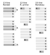 In larger rondeau variants, each of the structural sections may consist of several verses, although the overall sequence of sections remains the same. Variants include the rondeau tercet, where the refrain consists of three verses, the rondeau quatrain, where it consists of four (and, accordingly, the whole form of sixteen), and the rondeau cinquain, with a refrain of five verses (and a total length of 21), which becomes the norm in the 15th century.[1] In the rondeau quatrain, the rhyme scheme is usually ; in the rondeau cinquain it is.