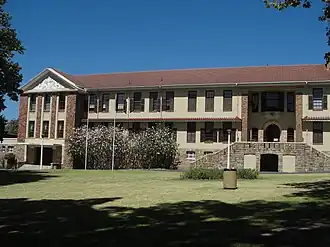 By August of the same year, the school in the little church hall was attracting a lot of interest, and its name had been changed to the Boys' High School, Rondebosch.[1] With the large number of applications the school was receiving from the local residents, the school committee was forced to become more selective in acceptances. Before the end of the year, the committee was looking for a site to construct a new, considerably bigger school. Soon after their search began, a nearby property - The Firs, a site with an area of almost one acre of ground, at the corner of Campground and Rouwkoop roads came up for sale. The committee negotiated a loan with the Standard Bank and bought the property for an amount of £1 900. The architect commissioned to design the new school was G G Milne.[1][2] Teaching in the new school commenced on 7 September 1898.[1] In 1947 the High School on Campground Road moved to its current location on Canigou Ave. The buildings at this location, including the Canigou boarding house, were designed by architect Kilgour Parker, who was an Old Boy of the school, and well known Cape Town architect. His firm also were the architects for Wynberg Girls' High School and Rustenburg Girls' High School, as well as several other schools in the Western Cape.
