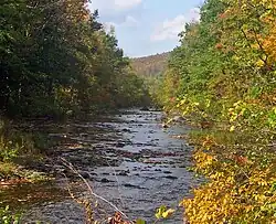 Rondout Creek is a 63.3-mile-long (101.9 km)[3] tributary of the Hudson River in Ulster and Sullivan counties, New York, United States. It rises on Rocky Mountain in the eastern Catskills, flows south into Rondout Reservoir, part of New York City's water supply network, then into the valley between the Catskills and the Shawangunk Ridge, where it goes over High Falls and finally out to the Hudson at Kingston, receiving along the way the Wallkill River.
