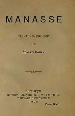 His play Manasse, published in 1900,[5] expanded upon the ideas he set forth in Două măsuri.[1] It opened to a rousing debut at the Iași National Theatre in March 1901;[2] the Bucharest premiere took place at the Rașca Garden in May 1904.[5] The play's Iași success was repeated at the Bucharest National Theatre in February 1905:[2] Constantin Nottara played Manasse, and the show ran for 26 performances.[5] The play was very popular with audiences,[2] which included members of the Romanian royal family.[4] Its title character is the elderly Manasse Cohen, a conservative defender of Jewish tradition who resides in the Moldavian shtetl of Fălticeni.[1][6] His son Nissim Cohanovici, a Bucharest merchant, has only tenuous ties to the community. Nissim has two children, Lazăr and Lelia, who respect Manasse's faith but are also modern people who harbor socialist ideas and are integrated into the Romanian intellectual milieu. When Leila decides to marry a Christian lawyer, Manasse suffers greatly and eventually dies.[1]