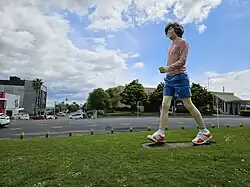 Boy Walking. A giant boy in shorts and striped t-shirt heads purposefully through Potters Park in Auckland. Van Hout, who used to live in the area, explained that the oversized child is moving into the future with confidence and his sculpture was exploring the notion of a child transitioning into adulthood.[33] The work was installed overnight.[34]