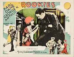 Rookies (aka Red, White and Blue) is a 1927 American silent comedy film directed by Sam Wood and released by Metro-Goldwyn-Mayer.[1] The film pairs the comedy teaming of Karl Dane and George K. Arthur as the stars of Rookies.[2] Because of the popularity of this film, this would be the first of several collaborations between the two actors. The comedy team of "... gangly Karl Dane and diminutive George K. Arthur... ... Clearly conceived to cash in on the success of Paramount's Wallace Beery-Raymond Hatton service comedy Behind the Front, this Dane-Arthur vehicle finds our mismatched heroes cast as a sergeant and private during WWI."[3]