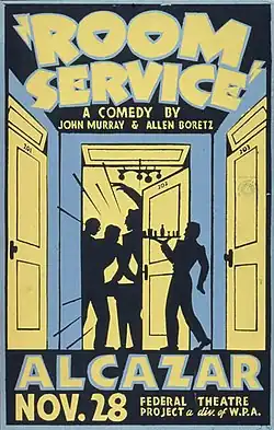 Room Service is a farce written by Allen Boretz and John Murray. It was originally produced by George Abbott and debuted at the Cort Theatre in New York City on May 19, 1937. Its initial production ran for 500 performances, closing on July 16, 1938.[1] The play, starring Jack Lemmon in the role of Leo Davis, was revived on Broadway for a short run of 16 performances in 1953.