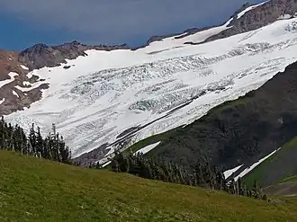 Roosevelt Glacier is located on the north slopes of Mount Baker in the North Cascades of the U.S. state of Washington.[2] Roosevelt Glacier descends to nearly 5,000 ft (1,500 m) at Chromatic Moraine.[2] In the middle of its course, Roosevelt Glacier is connected to Coleman Glacier to its south.