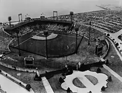 The ballpark's home opener was scheduled for April 22, 1937, with the opening of the 1937 International League season. Mayor Hague declared a half-holiday for the city's schools and employees. New York Giants owner Horace Stoneham was expected at the opener along with Senator Harry Moore.[8] Rain washed out the planned events and the opening game was moved back to April 23 with Mayor Hague throwing out the first pitch and Sen. Moore and owner Horace Stoneham on hand for the ballpark's dedication.[9] The Jersey City Giants took on the Rochester Red Wings with the Red Wings defeating the Giants 4–3 in front of an over capacity crowd of 31,234, a then minor league record.[5][7]