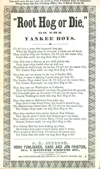 The most popular song of the era was a minstrel song variously titled "Root, Hog, Or Die" or "Do Jog Along", sometimes credited to George W.H. Griffin, which was first copyrighted in 1856.[4] Many variations exist—a common first verse is: