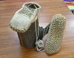 Bast shoes are made from bast fibres. They were traditional shoes of the peoples of the taiga forests of northern Europe and Russia. Bast shoes were an item worn by the rural poor; leather was preferred in cities. Bast shoes were time-consuming to make. The bark from three or four saplings was soaked in a press for a long period. Despite this, the shoes were somewhat disposable, only lasting a week or so.[3] Bast shoes were used until the mid-twentieth century. They did not always have a rope-like sole; it was common for bast soles to be crudely woven strips of bark.[4]