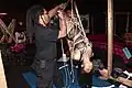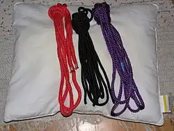 Rope bondage, also referred to as rope play, kinbaku, shibari or fesselspiele, is bondage involving the use of rope to restrict movement, wrap, suspend, or restrain a person, as part of BDSM activities.[1] Japanese bondage is the most publicly visible style of rope bondage. An alternative style, "Western bondage" is about achieving restraint; the Japanese style is more concerned with the artistry of the process.[2] String bondage is the wrapping of rows of string around a body area for arousal. String bondage is also known as "constrictions".[3][4]