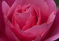 The cultivar grows shoots up to 120 centimetres (47 in) high with medium-sized very double flowers that are pink to pink red and have a very strong fragrance.[5] The rose flowers repeatedly beginning in May or June in the northern hemisphere.[3] The rose grows one to four flowers per stem that are 9 to 10 centimetres (3.5 to 3.9 in) in diameter.[1] The bloom has been described as pink, dark pink, or fuchsia-colored in the style of old roses or resembling a peony.[2][4] The petals are firm, which allows the flower to stay in shape in rain, the inner petals are sometimes whirled or quartered, and petals often have a thin light border and are sometimes crenated.[2] The shrub is very thorny, branches only below flowers, and has large green to dark green foliage.[1][5] Its habit is upright and bushy.[6]