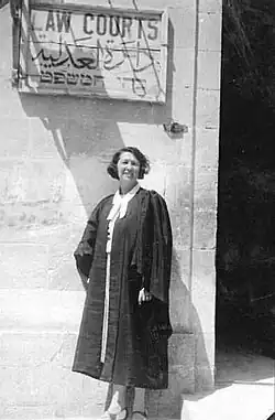She opened her own law practice in Jerusalem, becoming the only woman in the country to have her own practice for many years. Her work reflected her interest in helping immigrants, children, and women. She considered it a special mission to deal with cases brought by the British authorities against “illegal” immigrants. She was also one of the first people to bring the issue of adoption and child custody before the courts.[2]