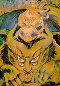 Her paintings, which have been compared to those of British occult artist Austin Osman Spare,[3] often depicted images of supernatural entities such as pagan gods and demons, sometimes involved in sexual acts. These caused particular controversy in Australia during the 1940s and 1950s, when the country "was both socially and politically conservative" with Christianity as the dominant faith and at a time when the government "promoted a harsh stance on censorship."[2] For this reason the authorities dealt with her work harshly, with the police removing some of her work from exhibitions, confiscating books that contained her images, and attempting to prosecute her for public obscenity on a number of occasions.