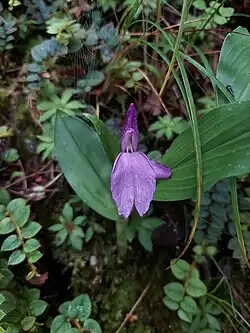 Roscoea bhutanica is a perennial herbaceous plant. Like all members of the genus Roscoea, it dies back each year to a short vertical rhizome, to which are attached the tuberous roots. When growth begins again, "pseudostems" are produced: structures which resemble stems but are actually formed from the tightly wrapped bases (sheaths) of its leaves.[3] R. bhutanica is one of the smaller members of the genus; plants are 8–14 cm tall, with around four to eight or more leaves, the first two to four being bladeless, the others with smooth (glabrous) blades 4–21 cm long by 1–1.6 cm wide. The leaves are clustered together at the base.[2]