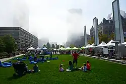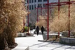 The North End Parks (Boston Big Dig parcels #8 and #10, lying on opposite sides of Hanover Street) reflect the history and scale of the adjacent North End neighborhood.[37] They were designed by two teams of landscape architects: Boston's Crosby, Schlessinger, Smallridge LLC[38] and Seattle's Gustafson Guthrie Nichol Ltd.[37] Lawns surrounded by densely planted perimeter beds are designed to evoke a formal feel of past European style gardens with boxwood hedges enclosing an array of perennials. A trellis and "pergola" along the eastern edge offer public seating and a vantage point that overlooks both greenspace and historic buildings. The "canal fountain," a shallow water feature with fountain jets, reflects a period approximately a century ago when a canal connected the harbor to now defunct industrial operations.[39] During the warmer months, the North End Parks host free fitness classes and other events.