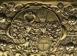 The Rose Flower Cup, which holds six litres (eight pots) and has a weight of almost six kilos, is designed in the form of a generous barrel with two handles. Compared to normal tankards, its second handle was a necessity due to its massive size. As is the case with so-called peg tankards, it is fitted on the inside with pegs at regular intervals to mark the quantity each person is supposed to drink. The exterior is decorated with hunting scenes, probably as a reference to Frederick III, who was an enthusiastic huntsman. Hans and Anne Skovgaard's coat of arms is also part of the decoration. A red and white rose has been interpreted as representing the union of the sun and the moon giving birth to the Filius philosophorum.[2] A medallion on the interior of the cover, depicting David playing before King Saul, is most likely a reference to the recipient (Frederik) and the giver (Skovgaard).[2] The exterior is also inscribed with the year 1577 as well as a verse:[3]