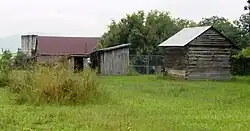 The smokehouse, constructed around 1850, is built of hewn logs and is accessed by a board and batten door with iron hinges. The double-cantilever barn, built late-19th century, is a double-pen barn retaining much of its original cantilevered form, although a tractor shed was later added to the barn. The hay barn, located across the street from the main house lot, is a rack-sided barn with a gambrel roof, built in the 1920s. Except for the smokehouse, all the outbuildings are frame structures.[3]