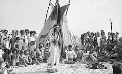 During the winter season, dressed in tribal costume, Yellow Robe visited schools and public libraries to tell Lakota stories and legends.[20] In the summer of 1932, Rosebud staged a ceremony characterized as a "Peace Council Fire" that attracted a crowd estimated at 1,000 people, including 300 children.[17]