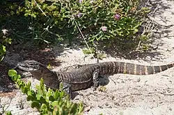 They are highly active carnivores, able to pursue large prey, and opportunistic generalists whose diet includes birds, reptiles, mammals, eggs, and carrion.[11][5] Analysis of the island population in South Australia revealed that the majority of their diet is reptiles and mammals, with a third of their diet being invertebrates, primarily species of acridid grasshoppers, areneid sea snails, blattoid cockroaches and beetles. Some amphibians, mostly Limnodynastes frogs, and a small proportion of birds were also found to have been captured and consumed, but invertebrates would be found during its regular foraging activities through soft soils and detritus. This goanna has been observed eating road kill, including possums and wallabies, and consumption of these may account for a significant proportion of the mammal component of their diet. The native Australian bush rat is likely pursued and caught, but the records of consumption of the western grey kangaroo and brush-tail possum is likely the discovery of their carcasses.[5]