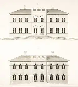 Michael Gottlieb Bindesbøll's main building is a two-storey building constructed in local limestone. The building is eight bays wide and has a slightly projecting median risalit. It is topped by a hip roof with four chimneys. The main building is flanked by two one-storey, half-timbered side wings with red tile roofs that date from the 17th century. The eastern side wing is the former kitchen wing. The western side wing was used for the administration. To the south of the main wing is a large garden.[2]