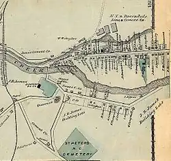 The village remained sparsely populated[20] and only consisted of two houses when the Delaware and Hudson Canal reached it[17] after the materials used to manufacture Rosendale cement, named after the town, were discovered locally in 1825.[21] Early settlers had avoided the area because the northern land, comprising present-day Rosendale Village, was a known floodplain, and the lands south of the creek were less mountainous and at a higher elevation.[22]