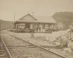 By 1835 the village contained a hydraulic cement plant, a post office, tavern, and several stores and houses.[23] When the surrounding town of Rosendale was created from parts of Hurley, New Paltz and Marbletown on April 26, 1844, the village was referred to by the same name as the town.[17] On December 7, 1847, New York passed a law which allowed the municipal incorporation of villages within the state.[24] The Wallkill Valley Railroad was opened to Rosendale in 1871, with the Rosendale trestle across the Rondout Creek completed the following year.[25] James S. McEntee, a former Delaware and Hudson engineer, was the only person to have seen the opening of both the canal and the trestle.[26] The Rosendale station was the largest depot on the Wallkill Valley rail line.[27] Unlike the other stations on the line, it was designed to have an "L" shape, rather than being rectangular, because the building was "squeezed by the severe slope behind it".[28] In 1888, a pinkeye outbreak killed off many horses in Rosendale and along the canal.[29]