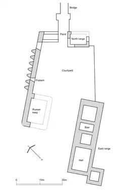 To the south of this wall is the remaining wall of the keep. The mound beneath is formed from the collapsed remnants of the other three walls. The ruin suggests that the keep was around 16m by 12m, with walls 2.9m thick rising to a machicolated parapet.[12]