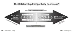 Rosenberg’s Relationship Compatibility Theory uses numerical values to represent the distribution of qualities such as love, respect, care, trust, and protection (LRCTP) in relationships. When these values are inversely matched—for example, a (-5) codependent with a (+5) narcissist—their sum equals zero, creating what Rosenberg refers to as a zero-sum relationship. He contends that such relationships are often stable but dysfunctional due to their complementary imbalances.[18][19][20]